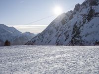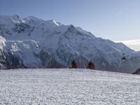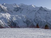 A view of the snow-covered mountain range of the French Alps on a sunny winter day, with a ski slope, glacial moraine, and gondola visible in the distance, offering a stunning overview of the natural beauty of the highland wilderness and the popular tourist attraction.