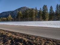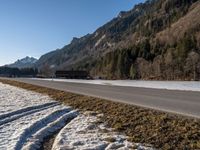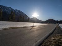 A snow-covered road winds through a rural German landscape, with snow-capped mountains in the distance and a clear sky above, illuminated by the sunlight of a sunny winter day.