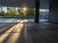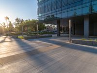 The sun rises above the modern architecture of Los Angeles, California, USA, casting a hard shadow on the concrete urban surface. The break of day brings a clear sky and sunshine to the city.
