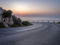 a curve road along the beach with the sunset on the horizon over the water behind it