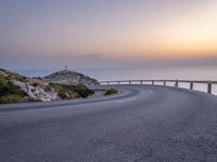 a road at the edge of a cliff next to the ocean at dusk, on which there is a light tower