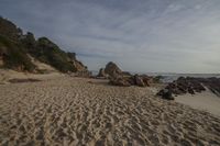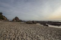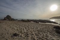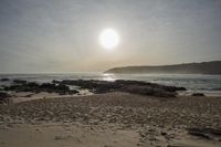 A stunning view of the dawn breaking over the coastal sand and water, creating a picturesque landscape.