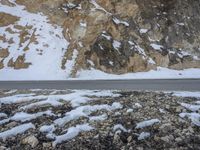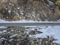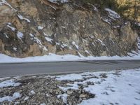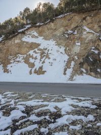 The break of day reveals a stunning winter landscape of snow-covered mountains, rugged cliffs, and icy rock walls in Shangri-La, Yunnan, China. In the foreground, a winding road of asphalt leads through the wild and glacial tundra, showcasing the coastal lowlands and glacial soil of the Asian continent.