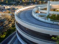 A top-down view of a residential parking deck in Los Angeles, USA, illuminated by the first rays of the sun as the dawn slowly breaks.