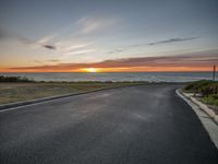 A beautiful view of a coastal road at sunset, with the afterglow reflecting on the road surface and the surrounding vegetation.