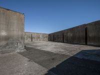 A clear sky frames a symmetrical landscape of a concrete street in a city, showcasing the road surface and its composite material. The rectangle-shaped fixtures and streetlights cast hard shadows on the asphalt, while the water reflects the tints and shades of the surrounding facades and brick walls. The open space and flooring create an inviting atmosphere during the day.