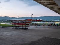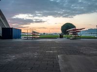 An asphalt paver and graffiti wall in the Republic of China's Taipei city stand in an open plaza near a river at the break of day, making an urban design profile of the street art and city life.