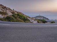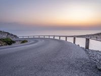 The sun rises over the coastal landscape of Mallorca in the Balearic Islands, Spain, as a winding road curves around an armco barrier and guard rail.
