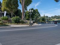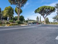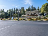 A winding road with classic architecture frames a glimpse of the residential villas, hotels and gardens of Florence, Italy, on a clear day in the lush Tuscan landscape.