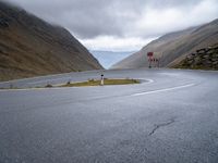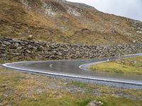 A wet, gloomy day reveals an asphalt road winding its way through the mountain landscape of Timmelsjoch in Austria, Europe. The open space provides an overview and overlook of the switchback curves and straight roads below. Nature in all its glory is on display in this grey sky view.