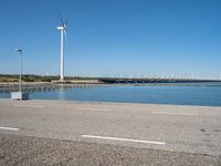 A motor vehicle tire rolls along the road surface on a calm, clear day in Holland. The azure sky is dotted with cumulus clouds and the natural environment features grass, trees, and a coastal wind turbine in the background.