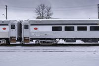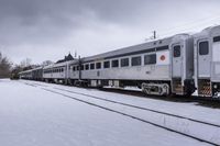 A gloomy winter day in Toronto, Canada with a grey sky and rolling clouds. The image shows an industrial area with factories and a railroad track. Public transportation vehicles, including trains and boats, can be seen on the snowy surface.