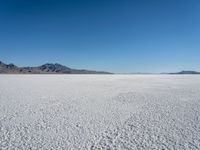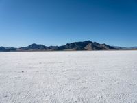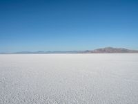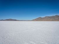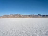 Two lanes of motion blur trace the open space of the Bonneville Speedway at Salt Lake City, Utah, USA. The golden sunshine of the desert illuminates the salt surface and the distant mountains in the clear sky above.