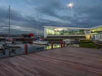 At the break of day, artificial lights illuminate the wooden floors of the jetty by the lake, casting reflections on the water. The open space offers a peaceful retreat, with clouds drifting lazily overhead. A quarter of the pier is bathed in gentle light, creating a serene atmosphere in this natural setting.