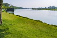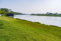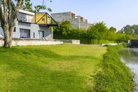 A beautiful lakeside villa surrounded by lush green grass, trees, and vegetation in Thailand, offering a serene and peaceful retreat.