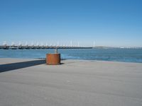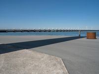 A view of the coastal landscape of Holland, with its asphalt roads, wind turbines, windmills, and bridges. The shore of the azure lake reflects the clear sky and the trees cast a hard shadow on the shore. The fluid ocean and its waves can be seen in the horizon, while the parallel lines of the fixed link and the jetty create a sense of symmetry and urban design.