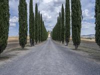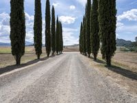 The winding gravel road of Tuscany, Italy, leads through a lush green landscape of nature, trees, and vegetation. The field is surrounded by cypress trees, and a forest of woody plants, creating a natural environment of recreational harvest gardens.