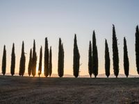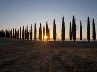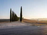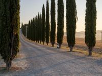 A rural gravel road in Tuscany, Italy, surrounded by a rugged landscape of cypress trees and open space, bathed in the morning sun of a clear day.