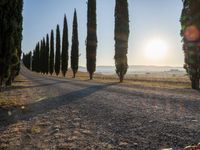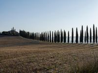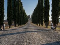 The sun shines on a rural road in Tuscany, Italy, as it winds its way straight down the road. The dirt and gravel path is surrounded by open space, nature, and a rugged landscape with a cypress garden and harvest. A clear sky creates a sunny day.