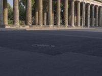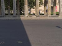 an empty street lined with pillars and a building in the back ground is a large group of people walking along it