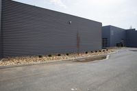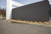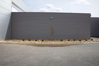 the wall is painted gray with a border of gravel and trees around it in front of an industrial building