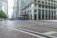 A view of the urban architecture in Houston, Texas, with a mix of low-rise buildings and high-rise skyscrapers. The cityscape showcases the classic architecture of the office buildings, hotels, and mixed-use neighborhoods. The bustling metropolis is filled with vehicles and public transportation, including trams and cable cars. The downtown area is lined with wide lanes and thoroughfares, with pedestrians crossing the zebra crossings. The buildings feature beautiful facades with windows and doors, while trees provide a touch of greenery in the urban landscape. The photo captures the city under a cloudy grey sky, adding to the metropolitan atmosphere.