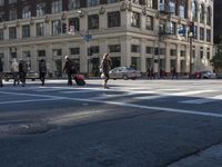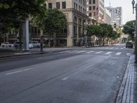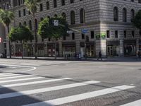 A view of the vibrant cityscape in Los Angeles, California, USA, showcasing the classic architecture and urban design in this metropolitan area. The photo captures a mix of buildings, roads, and public spaces, with pedestrians and vehicles moving along the asphalt lanes. The hard shadows create a striking contrast against the sunny day, while the foreground features a tree-lined open space. This image represents the dynamic city life and infrastructure of Los Angeles.