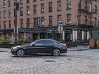 the mercedes cla sits on the side of a cobblestone street in the city