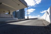 A sunny day in North York, Ontario, Canada, showcasing the urban architecture and infrastructure. The road surface, lined with concrete and asphalt, leads to high-rise buildings and residential areas. The blue sky and fluffy clouds cast shadows on the race track, while the sun shines brightly on the cityscape.