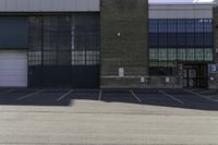 an empty industrial building with windows in the middle of it and an empty parking lot to the side