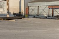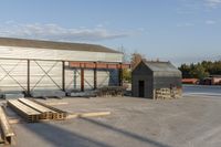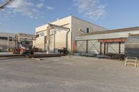 a building with a lot of construction equipment near it's entrance in an industrial area