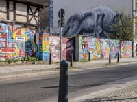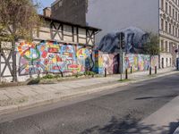 The yellow facade of a residential building stands out against the clear sky in a metropolitan area of Berlin, Deutschland. Graffiti lines the art district walls and a mural decorates the asphalt lane as people pass by the public space filled with urban visual arts.