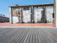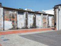 A paver-lined street in Kaohsiung, Taiwan runs parallel to a brick wall in an urban art district. The clear day gives the hard shadows a crisp edge as the sun shines through a cloud-filled sky.