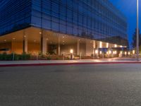 A road in downtown Los Angeles, California, USA with modern architecture illuminated by artificial light at the break of day.