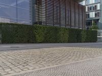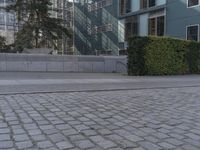 A modern office building in a bustling business district of Berlin, Germany, with its grey brickwork, tar roads, vegetation, and other features of urban design.