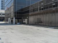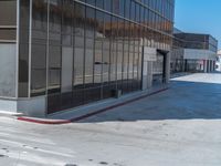A modern office building in the bustling city of California, USA, with clear blue sky and a hard shadow on the asphalt surface.