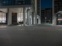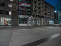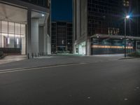 A view of a bustling urban business district in a city, with tall office buildings, shops, and storefronts along the road surface.