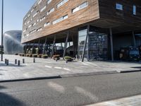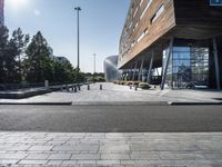 A view of an urban business district on a sunny day in Holland. An office building, hotel, and condominium are visible, along with a composite material road surface, parking, and a variety of vegetation providing shade and tints and shades. Automobiles, street lights, and public spaces create a modern, urban design.