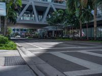 a street with crosswalk and traffic in an urban setting with palm trees on either side