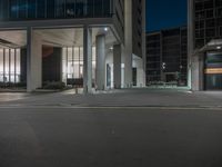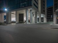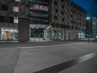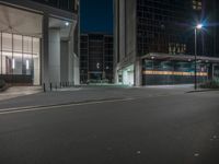 A bustling city with office buildings, shops, and street lights illuminating the urban landscape.