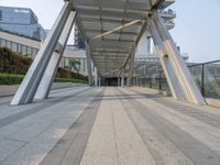 A clear day in Shenzhen, China reveals a bustling business district filled with modern architecture, urban design, infrastructure, and nonbuilding structures like bridges and skyways. Pedestrians make their way through a plaza filled with vegetation, trees, and a parking lot, while a concrete bridge and pergola provide a fixed link between a residential area and the metropolitan area. Asphalt and pavers line the roads and walkways, and a botanical garden provides shade and a hedge for the buildings and skyscrapers.