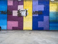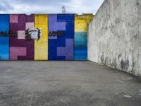 colorful wall with large graffiti artwork in a empty parking lot at an alleyway with building to the side