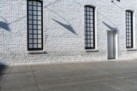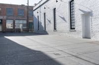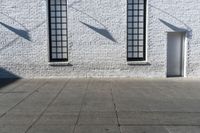 A brick wall facade and a stone wall feature in this urban city design with grey asphalt road surfaces, a symmetrical property featuring a door, window, and rectangular wood fixtures, elevated above the street lights and residential area below, with a clear sky in the background.