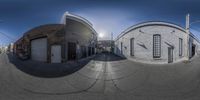 A low brick building in an urban residential area, with asphalt roads, open space, and a clear sky. The facade has windows, high infrastructure, and a road surface. Shadows and public spaces create a unique curb and urban design, with grey concrete, tar, street lights, and electricity. A brick wall is elevated, creating a hard shadow and a slope.