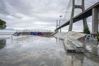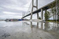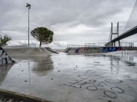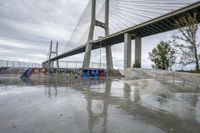 The gloomy dawn in Lisbon, Portugal reveals a concrete bridge, a cable-stayed bridge, a road surface, a lake, graffiti on a wall, a skatepark in an underpass, trees, and a suspension bridge reflecting on the water. City life in Europe is encapsulated in this urban design of composite material structures and public spaces.