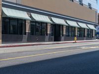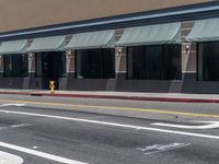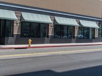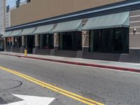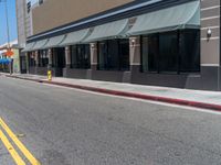 A bustling city street in California, USA, with modern architecture and storefronts, perfect for shopping and dining out on a sunny day.