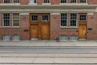 A bustling urban city street with asphalt road and brick buildings in Toronto, Canada.