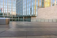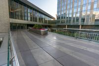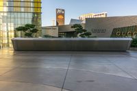 Aerial view of a futuristic office building and shopping district in Los Vegas, USA. The city comes to life as dawn breaks, revealing the urban design and concrete surfaces. The clear sky adds to the picturesque view of the city, with a straight road and bridge leading to the business district.