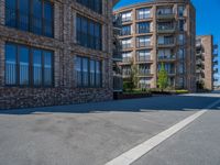 A vibrant urban cityscape captured in Germany. This photo showcases the modern architecture and urban design of a residential area. The clear sky complements the sleek lines of the buildings and the cobblestone road. The asphalt surface and brick walls add a touch of texture to the scene. Perfect for illustrating city life and the beauty of European urban landscapes.