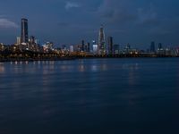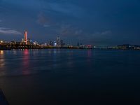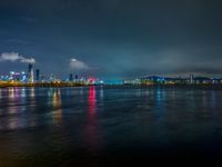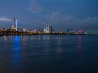 A vibrant skyline of Shenzhen in Guangdong, China is illuminated by artificial light as the coastal city overlooks the dark ocean and night sky.
